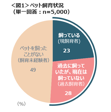現在、ペットを飼育している人(現飼育者)は23%、過去に飼育していたが現在は飼育をやめた人(過去飼育者)は28%と、合わせて51%はペットの飼育経験があった。<図1>