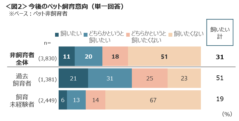 ペットを現在飼っていない人に今後飼いたいか確認したところ、31%が「飼いたい」意向があった。その中でも過去飼育者は、再び「飼いたい」が51%と半数を占めた。<図2>
