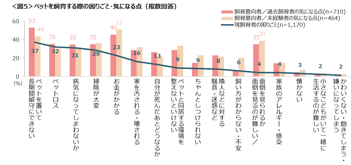 現飼育者の困りごとは、「長期間留守にできない」が37%、「ペットロス」32%、「病気になってしまわないか」31%などがあがった。一方、過去飼育者で今後飼いたい人の気になる点は、「長期間留守にできない」が53%、「お金」46%、「ペットロス」「掃除が大変」「面倒を見られるか」「病気にならないか」35%である。また、飼育未経験者の気になる点は「お金」が51%、「長期間留守にできない」44%、「面倒を見られるか」39%であった。現在や過去の飼育経験者では、ペットロスや健康などペットへの心配事が上位にあがる傾向にある。<図5>
