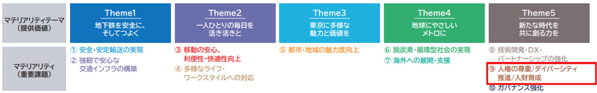 東京メトロは、グループ理念「東京を走らせる力」のもと、「安心で、持続可能な社会」の実現に向けて、サステナビリティを経営の中心に据え、5つのテーマに基づく価値を創造し、すべてのステークホルダーから選ばれる企業グループを目指しています。[LM広報1] サステナビリティ経営ビジョンにおいては、「人権の尊重」「ダイバーシティ推進」「人財育成」をマテリアリティ(重要課題)として定めており、社員一人ひとりの人権を尊重し、働きがいを高め、心理的安全性のもと多様な人財が活躍できる組織づくりを推進しています。中期経営計画「東京メトロプラン2024」においても関連指標をKPIとして設定し、様々な取組みを進めています。