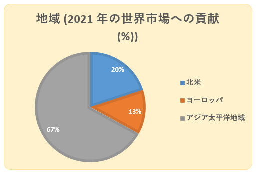 アジア太平洋地域は最大の機会を保持すると予想されて、総市場シェアの 67% を占めています。さらに、この地域は 2031 年までに約 5% の CAGR で拡大すると予想されています。成長の理由は、この地域の繊維産業と自動車産業の拡大です。一方、2番目に有利な地域は北米であり、地域市場は予測期間中に最高の速度で繁栄すると評価されています。