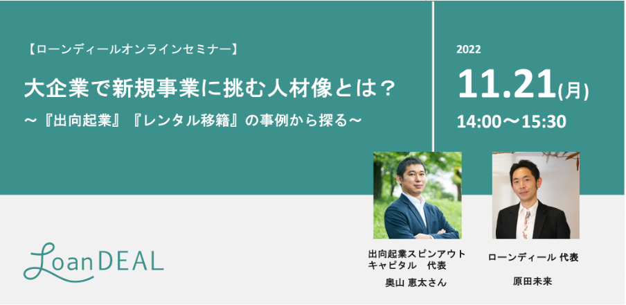 出向起業スピンアウトキャピタル代表の奥山氏とローンディール代表の原田が登壇し、レンタル移籍後に新規事業に挑戦する人や、出向起業に挑む人の具体的な事例をあげながら、大企業で新規事業を起こせる人材像を炙り出していきます。