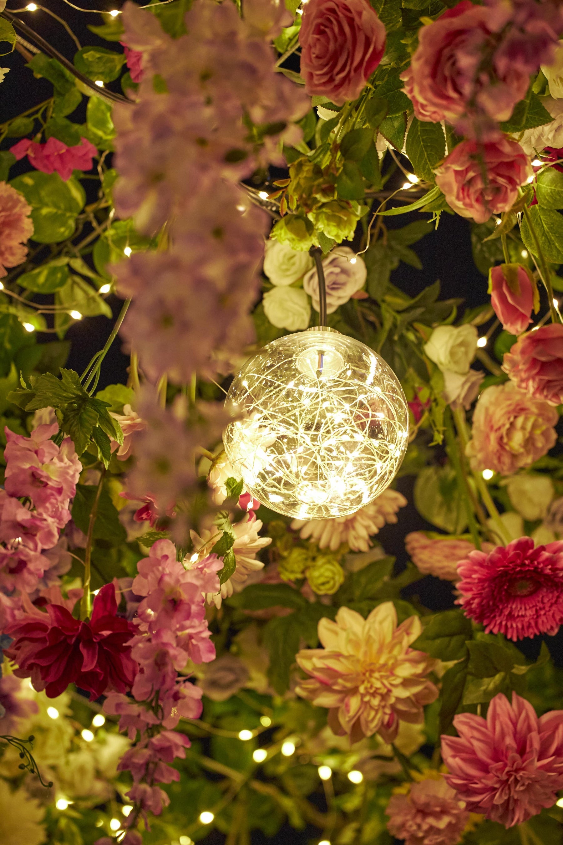 ライトアップタイムを迎えると、優しい明かりが花々を照らすロマンティックな空間に変化します。