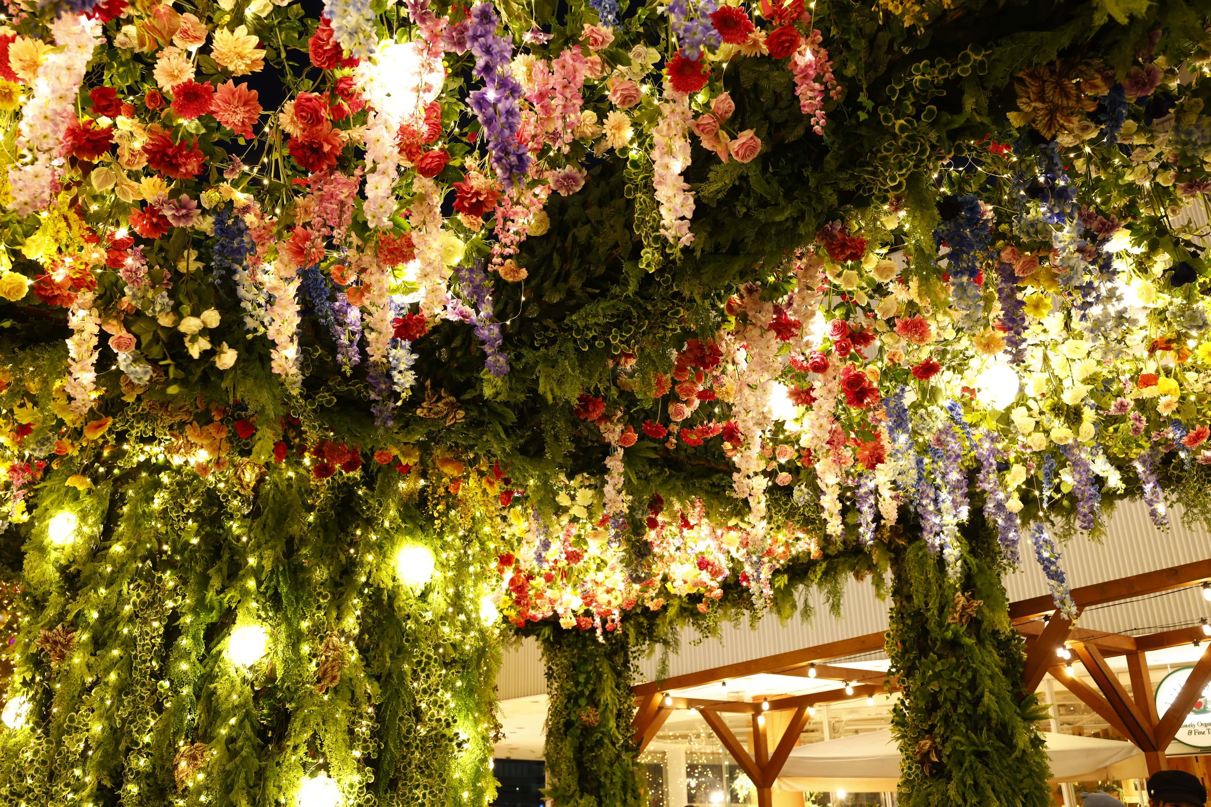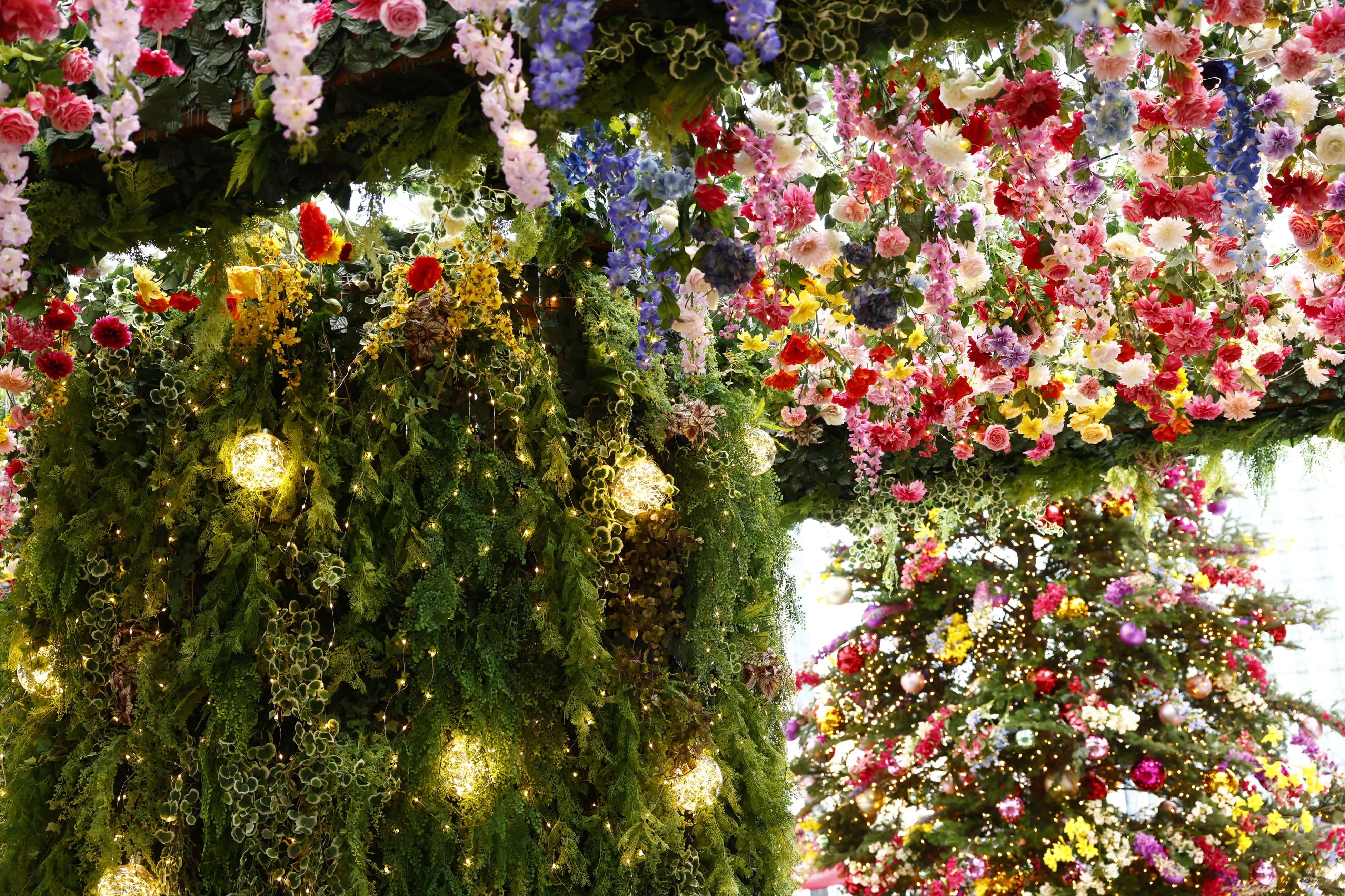 広場に設けられたデッキには、幾多の花束が吊るされた「フラワールーフ」や「フラワーウォール」がかかり、昼間でも華やかなクリスマスを演出。