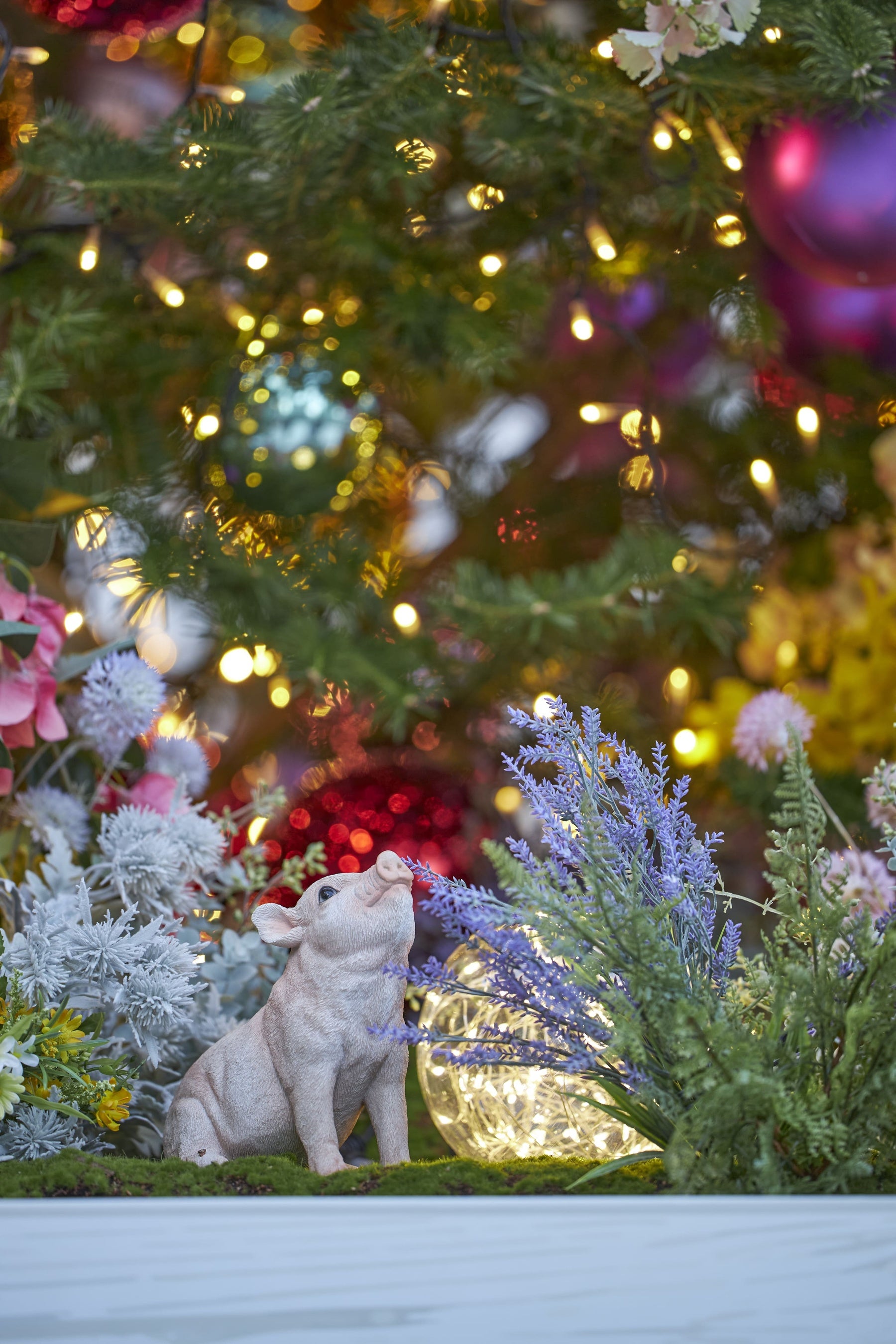 高さ8mの本物のモミの木は色とりどりの花々とシャンパンゴールドのライトで彩られ、ツリーの根元にはクリスマスフォレストに暮らす動物たちの様子を覗きみることができます。