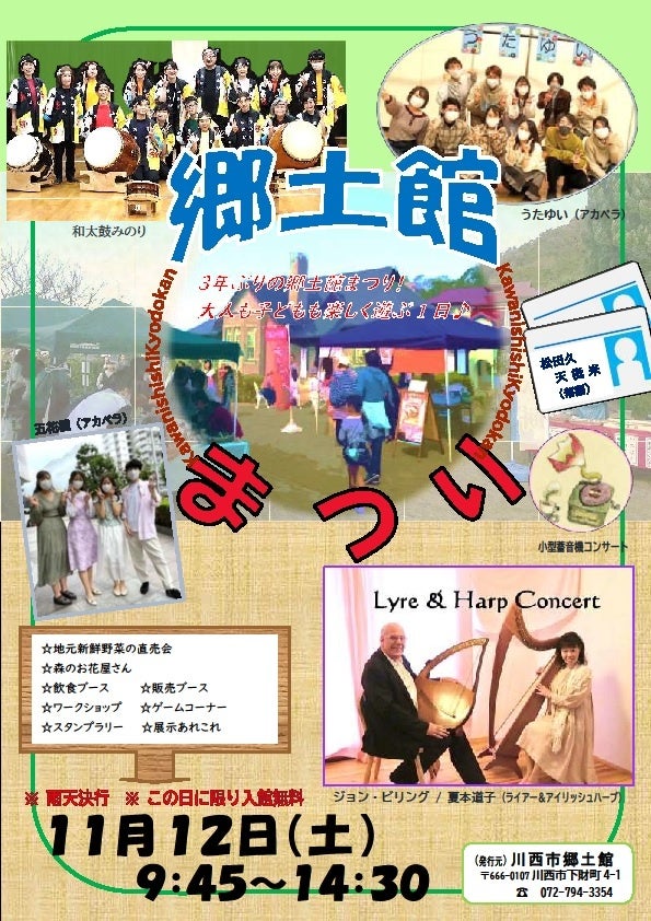 ・ジョン・ビリングさん(ライアー)と夏本道子さん(アイリッシュハープ)のコンサート・和太鼓みのりによる和太鼓演奏・大阪大学の学生によるアカペラコンサートや落語・小型蓄音機コンサート