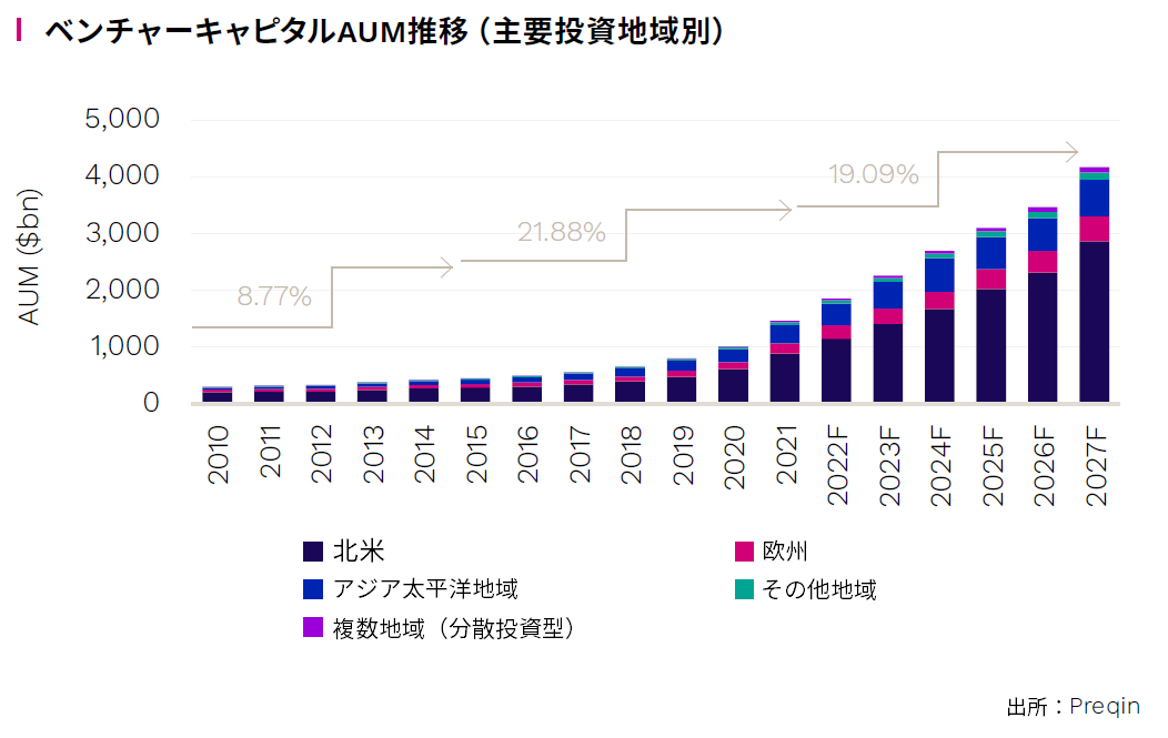 ベンチャーキャピタル(VC)は、今後数年で最も成長が見込まれるアセットクラス(AUMの年平均成長率=19.1%、2021年末の1兆4,600億米ドルから2027年予測は4兆1,700億米ドル)。VCの資金調達の中心は北米で、北米における年間の資金調達額は2021年末の1,180億米ドルから2027年末には2,230億米ドルへ。欧州でも2021年末の213億ドルから2027年末には305億ドルに拡大見込み。次いで成長性の高いアセットクラスは、インフラ(年平均成長率=13.3%)、プライベートデット(同10.8%)