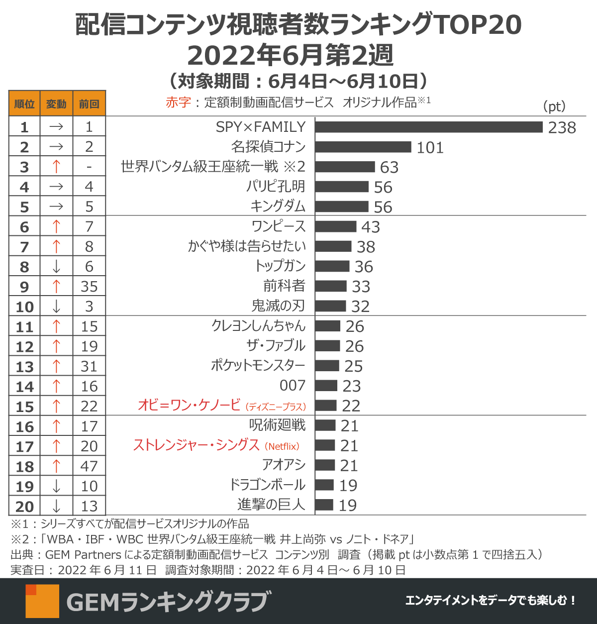 そのほか、圏外からランクアップしてTOP20入りした作品には、前週31位から13位となった『ポケットモンスター』シリーズ、前週22位から15位となったディズニープラスのオリジナル作品『オビ=ワン・ケノービ』、前週47位から18位となった『アオアシ』があります。
