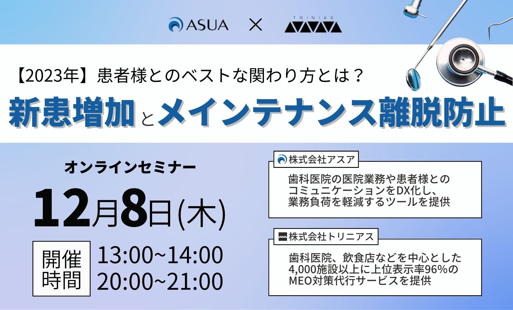 株式会社トリニアス(本社:東京都新宿区、代表取締役社長:山口慎一郎、以下当社)は、12月8日(木) 13:00~14:00 / 20:00~21:00 よりオンラインセミナーを開催いたします。