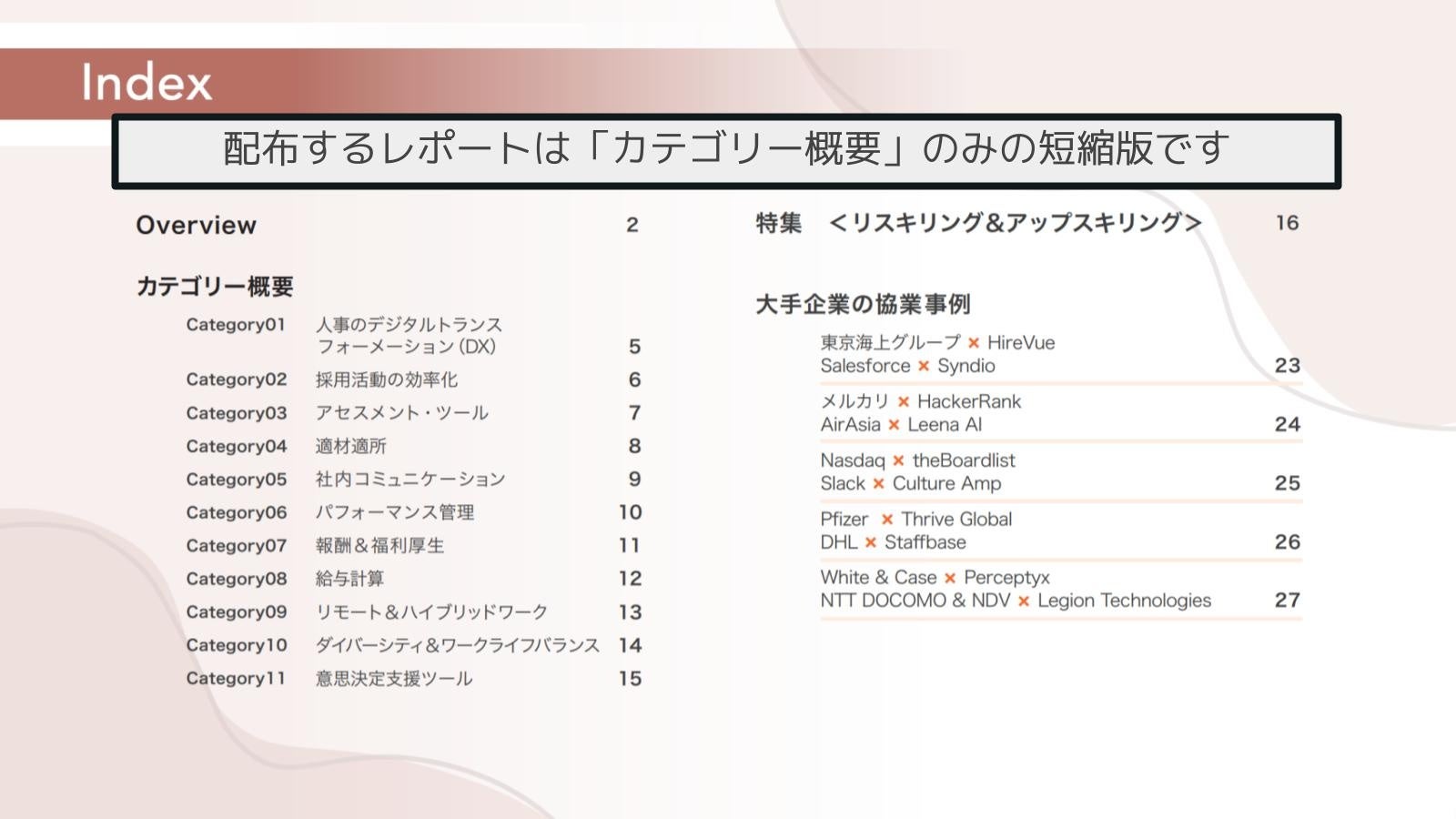 本レポートでは、人事業務のデジタル化、パフォーマンス評価、給与と福利厚生、ハイブリッドワーク、ダイバーシティ、そして“リスキリング”を含むスキルアップなど、HRテック分野のスタートアップを幅広く取り上げました。