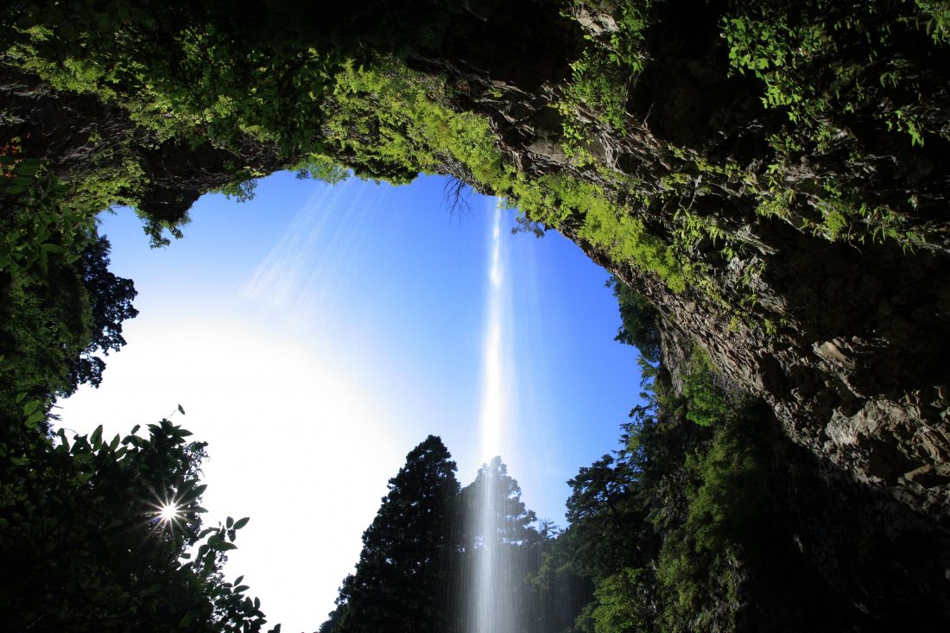 「日本の滝百選・日本名水百選」に選ばれている隠岐の島町内の自然スポット。滝の落差は約40mあり、付近ではミストのような水しぶきを感じることができます。滝を裏側からも眺めることができるほか、滝に通ずる参道は、老杉が天をおおうように立ち並んでおり幻想的な場所です。