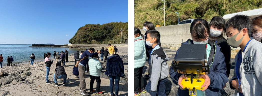 実際の海はどうなっているのでしょうか。調査隊一行は、いよいよ通詞島へ。まず、トサカノリの生息域を守るための取り組みの一つである10m四方の遮光シート30枚を設置している場所を上空のドローンと水中ドローンのライブ映像で確認しました。ドローンの操縦は、4班に分かれた班の代表が体験、海の中の様子をじっくり観察する機会は初めてで「インターネットで調べてみた写真と、実際の天草の海は全く違ったので驚きました」という感想もありました。海岸で予定していた海藻の収集は、海岸に打ち上げられたものがほとんどなく、実施できませんでしたが、子ども達は、目の前の海域で磯焼け対策がなされていることを知り、現実に起こっている海の課題を認識しました。