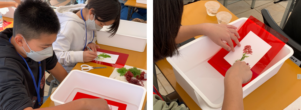 海藻について理解を深める方策として、海藻サラダの試食や、海藻の標本(海藻おしば)作りにもチャレンジしました。海藻の3種(緑藻類、紅藻類、褐藻類)の分類や食品としての魅力などについて、カネリョウ海藻の出口信さんに講義をしてもらいました。海藻を食べるのは苦手という子もいましたが、あっという間に平らげる子もいて、「海藻のために働く人の努力が感じられました。その努力に応えるためにも頑張って食べていこうと思えました」という感想もありました。
