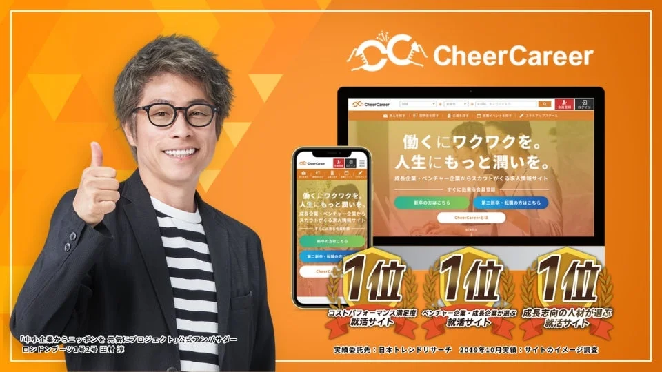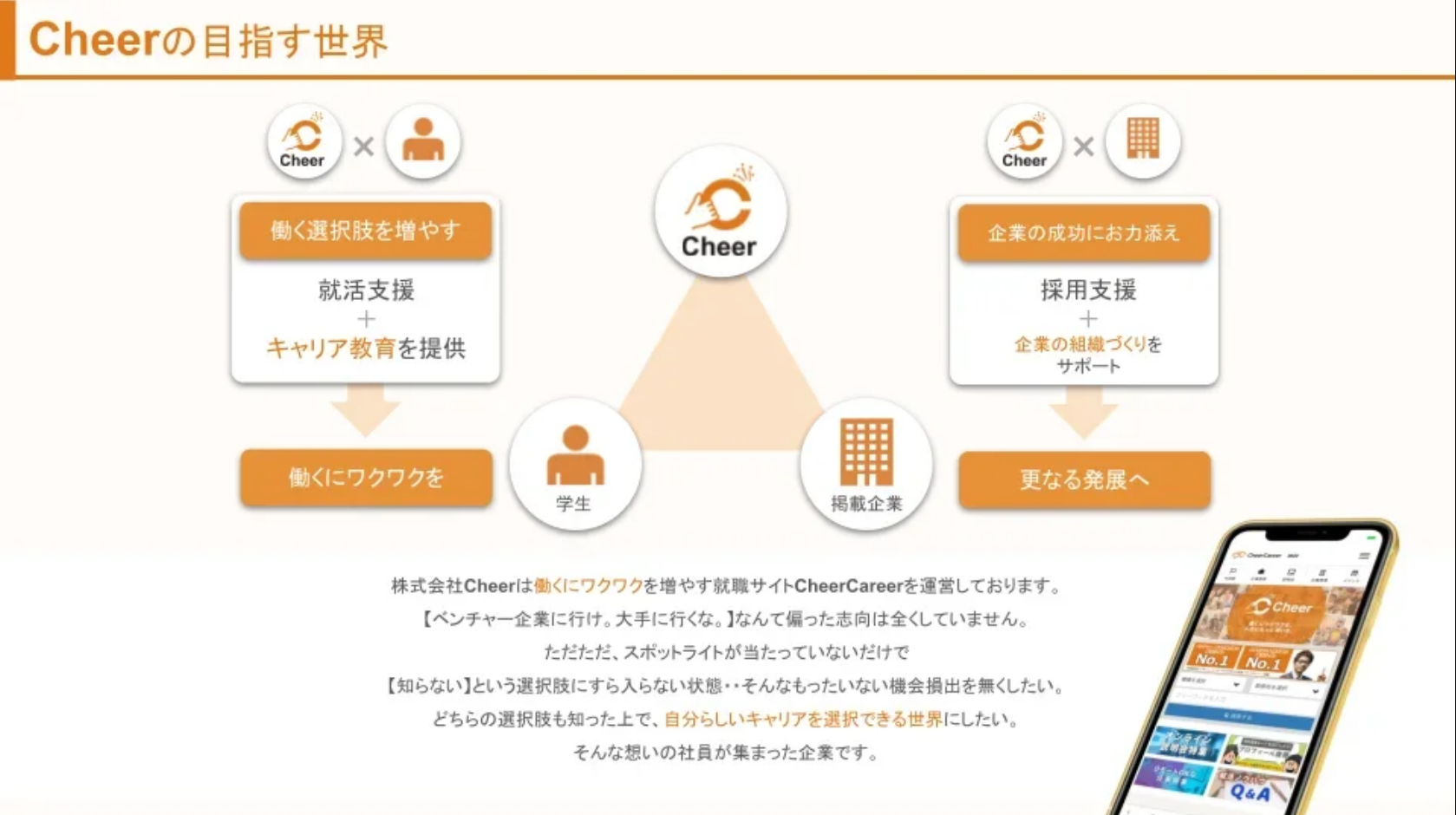 Cheerは、「働くにワクワクを。人生にもっと潤いを。」をミッションに掲げ、成長志向のバイタリティあふれる人材とこれから日本の経済を盛り上げていくべく挑戦を志すベンチャー企業とをつなぐ、就職プラットフォームビジネスを展開しています。Cheerの目指す世界観は大手に行くことを否定し、ベンチャーに行くことを啓蒙する偏ったものではなく、「知らないから選択肢に入っていない」という環境にスポットライトを当て、機会創出を進めるものです。