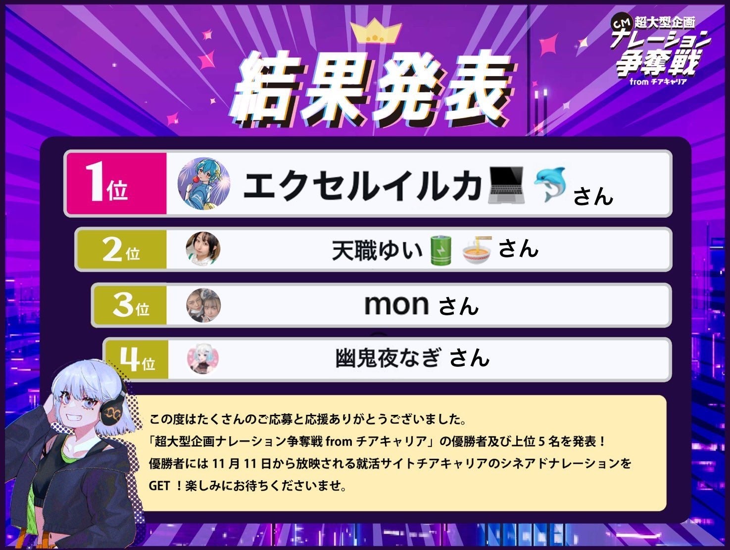 そして本日11月11日、優勝者の方と一緒に収録したナレーション入りのCMが劇場で放映開始されたことをご報告させていただきます。