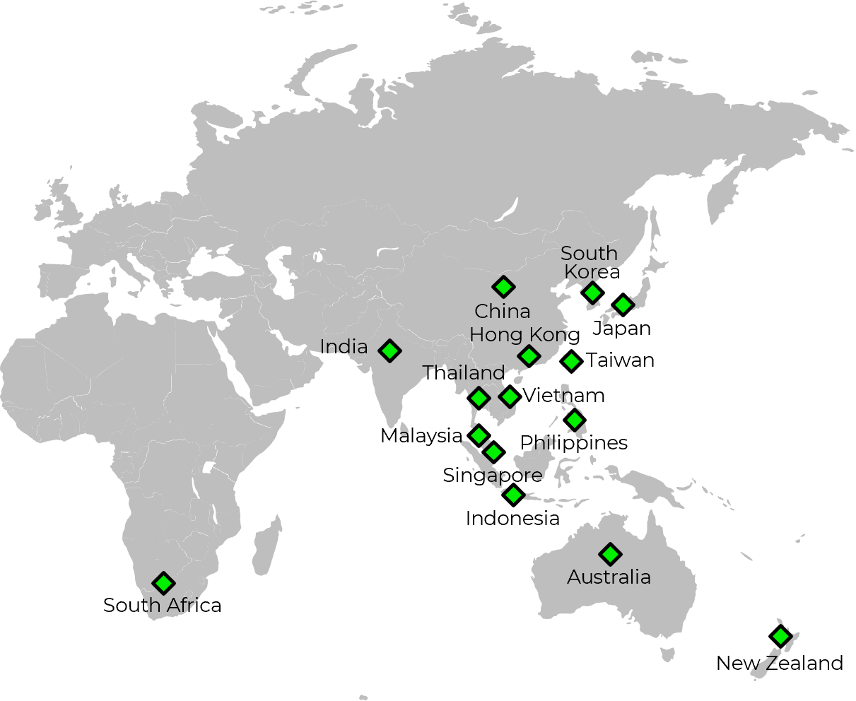 日本、韓国、台湾、中国、香港、ベトナム、フィリピン、タイ、シンガポール、マレーシア、インドネシア、インド、オーストラリア、ニュージーランド、南アフリカ 計15カ国の予定