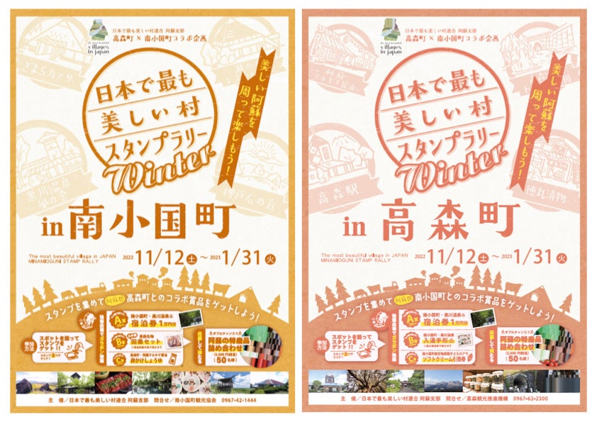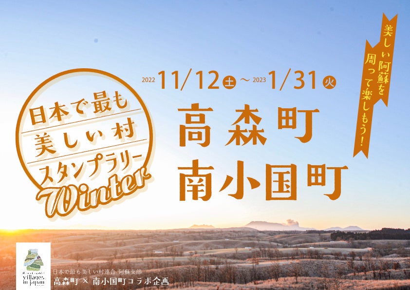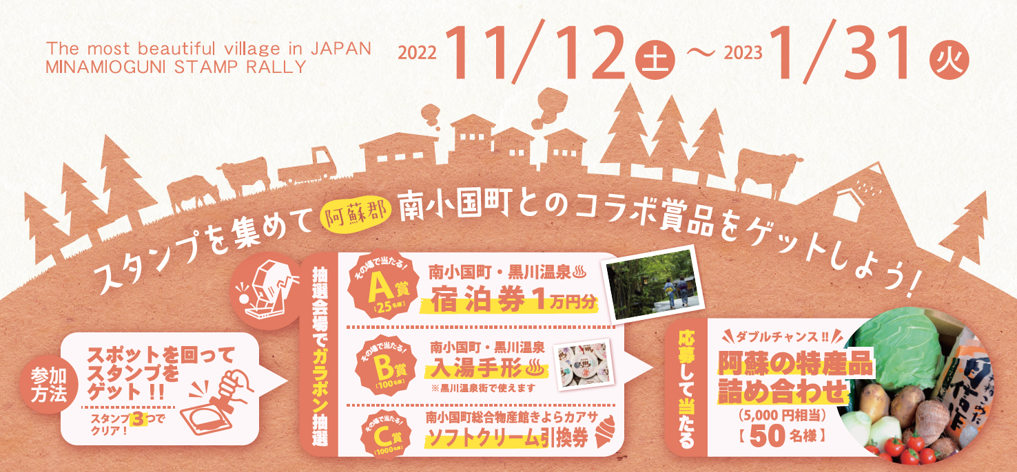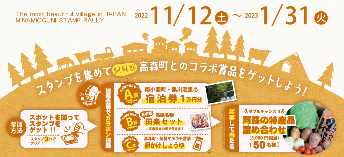 2022年11月12日(土)より、阿蘇郡の高森町・南小国町においてそれぞれの町でスタンプラリーを実施。4つのスポットの中から3つスタンプを集めると抽選場所でガラポン抽選会に参加が可能。特産品が当たるダブルチャンスも有ります。