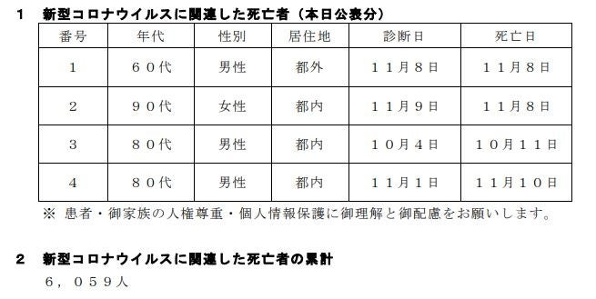 新型コロナウイルスに関連した患者の死亡について business Twitter Facebook はてブ Pocket LINE コピー 2022.11.13 この記事は約1分で読めます。 都内で新型コロナウイルスに感染した方が死亡されましたのでお知らせします。 お亡くなりになった方のご冥福をお祈り申し上げます。
