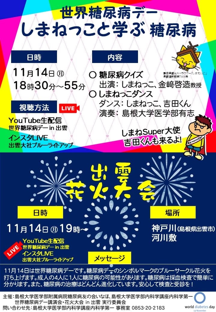 世界糖尿病デー(11/14)の企画で、19時~(約15分程度)神戸川河川敷(島根大学医学部附属病院近く・島根県出雲市塩冶町)でブルーサークルを含む花火を打ち上げます。糖尿病のイベントとしては9年ぶりの花火です。