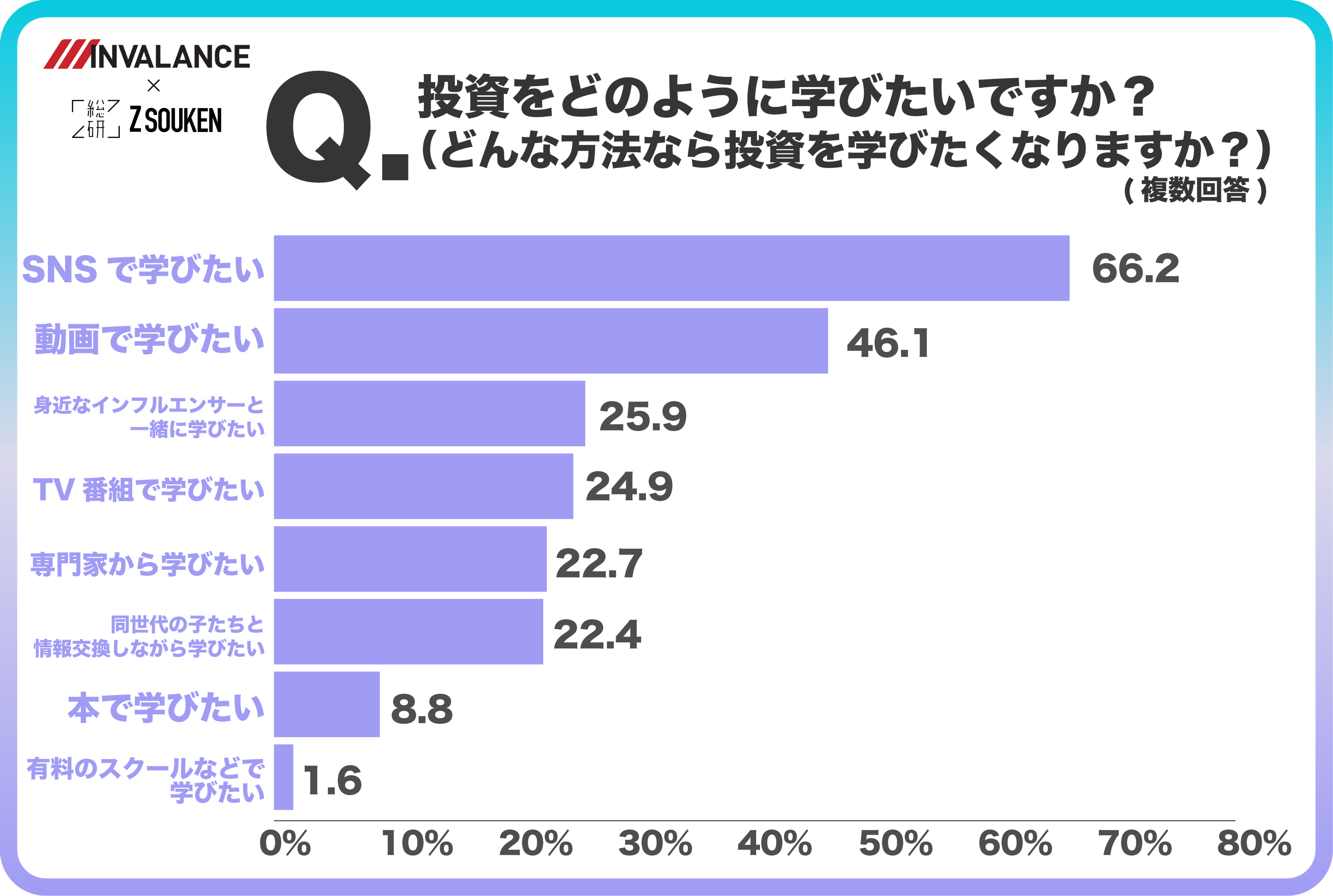 「投資をどのように学びたいですか?(複数回答)」という質問では「SNSで学びたい」が66.2%と最も多く、次いで46.1%が「動画で学びたい」、25.9%が「身近なインフルエンサーと学びたい」といった結果になりました。