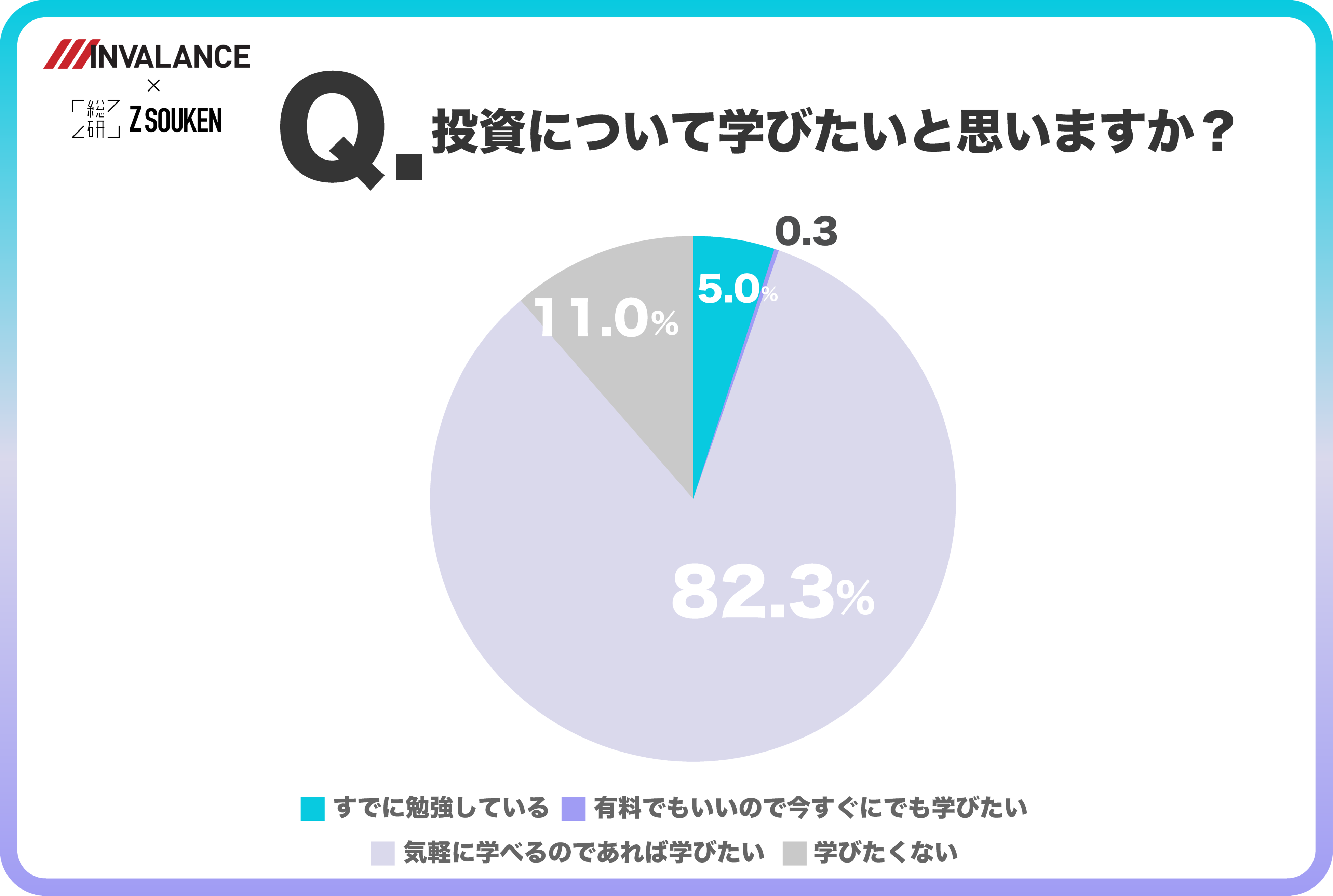 Z世代を対象としたアンケート調査で、「投資について学びたいと思いますか?」と質問したところ、「気軽に学べるのであれば学びたい」が82.3%で最も多い結果となり、8割以上のZ世代が投資を学びたいと思っていることがわかりました。