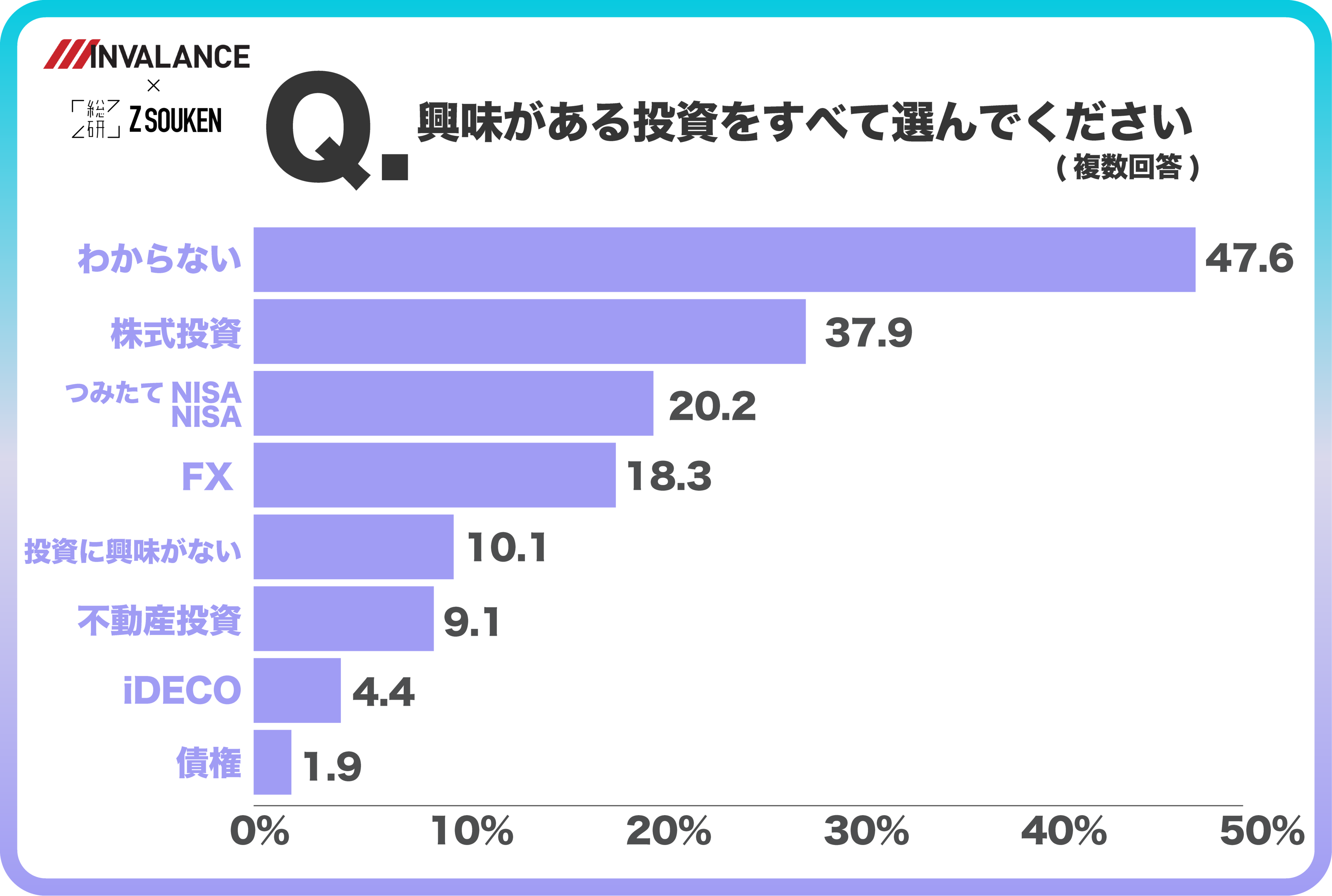 アンケートで「興味がある投資をすべて選んでください」という質問では、最も多かった回答が「わからない」で47.6%、次いで37.9%が「株式投資」、20.2%が「つみたてNISA・NISA」となりました。