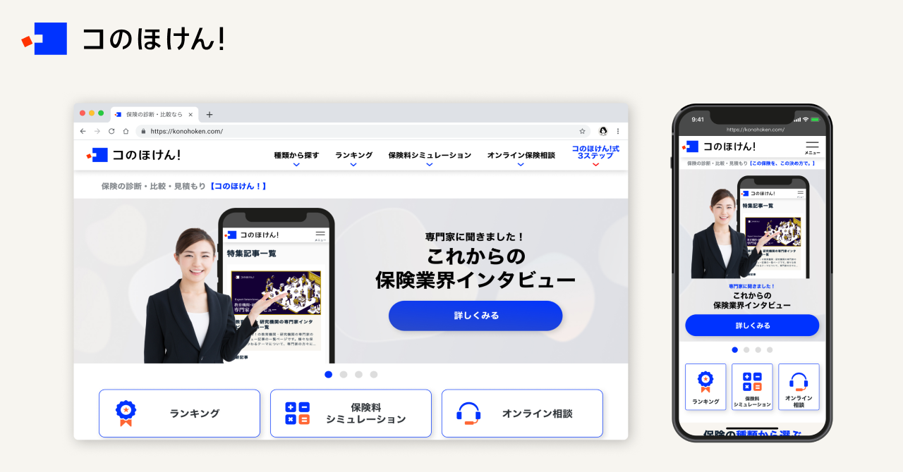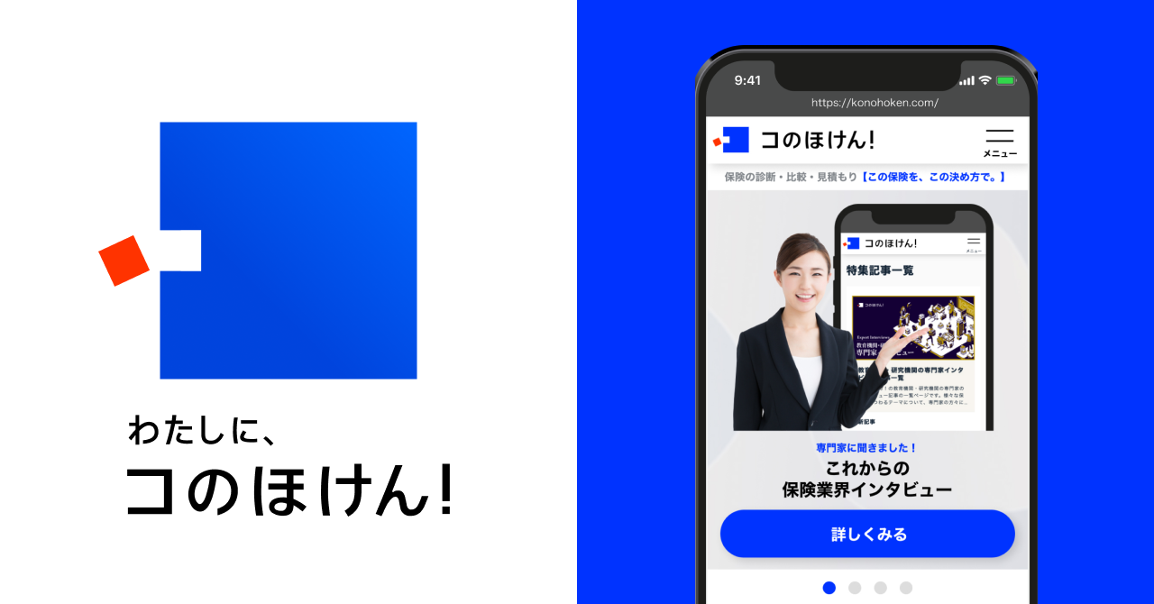 「コのほけん!」は、あなたのための、新しいオンライン保険サービス。個人ひとりひとりが「この保険に決めた!」と納得できるように、プロの知見とテクノロジーが融合したサービスです。保険の診断・一括比較・見積もり等、オンラインでお客様の保険選びをサポート致します。