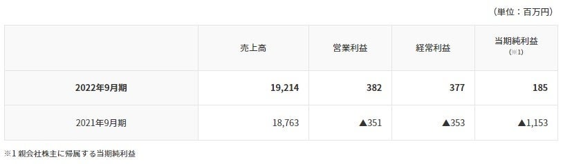 2022年9月期連結業績は、売上高19,214百万円、営業利益382百万円、経常利益377百万円、当期純利益185百万円となりました。