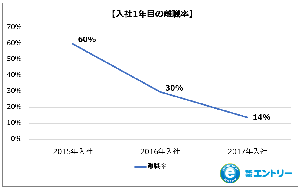 社員の個性や性格、バックボーンを理解することでその後の人材教育にも役立ち、同取り組みにより新入社員の離職率は約7割減少し、2015年が約60%であったのに対し2017年は約14%になりました。