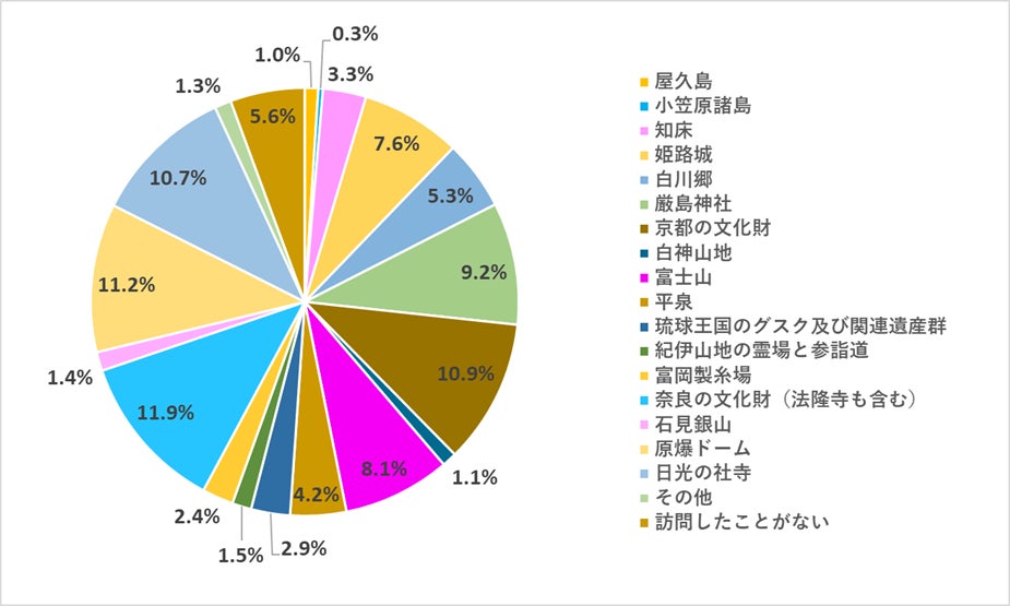 「これまでに訪問したことがある日本の世界遺産はどこですか?」の質問に対し、最も回答が多かったのは「奈良の文化財(法隆寺も含む)」で11.9%、次いで「原爆ドーム」が11.2%、「京都の文化財」が10.9%という順になりました。