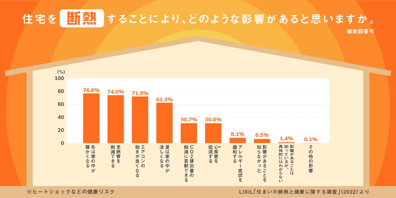 「住宅の断熱性能を高めることの効果」についての認知を問う設問では、「冬は家の中が暖かくなる(76.6%)」や「夏は家の中が涼しくなる(62.3%)」といった“室内の快適性の向上”についての認知が高かったほか、「光熱費を削減できる(74%)」や「エアコンの効きが良くなる(71.9%)」など“省エネ”に関しての効果についての認知も高い結果となりました。一方で、「心疾患(ヒートショックなど)の健康リスクを低減する(30.6%)」、「アレルギー症状を緩和する(8.1%)」など、“健康への影響”に効果の認知は低い結果でした。