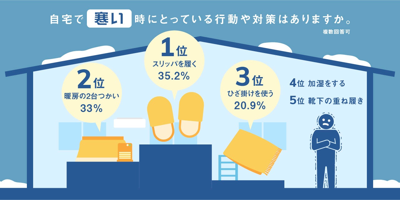 冬(主に11月~2月)に住まいで寒い時にとっている行動や対策を聞く設問では、「フローリングの上ではスリッパを履くようにしている(35.2%)」に次いで、「エアコンとストーブ、こたつとストーブなど複数の暖房を同時に使用する(33%)」が、3番目に多い「ひざ掛けを頻繁に使っている(20.9%)」と10%以上の差を開く結果となりました。