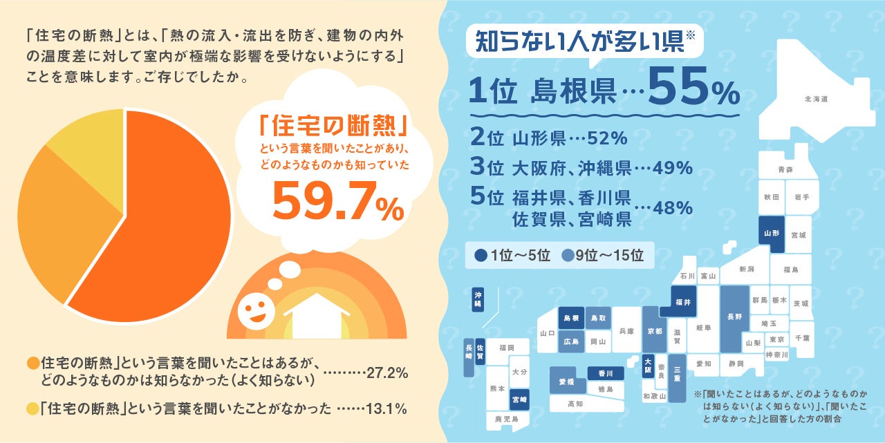 ■全体の約6割が「『住宅の断熱』という言葉を聞いたことがあり、どのようなものかも知っている」と回答。「住宅の断熱」の認知が最も低かったのは島根県の55%で、特に西日本エリアは認知が低い傾向に。