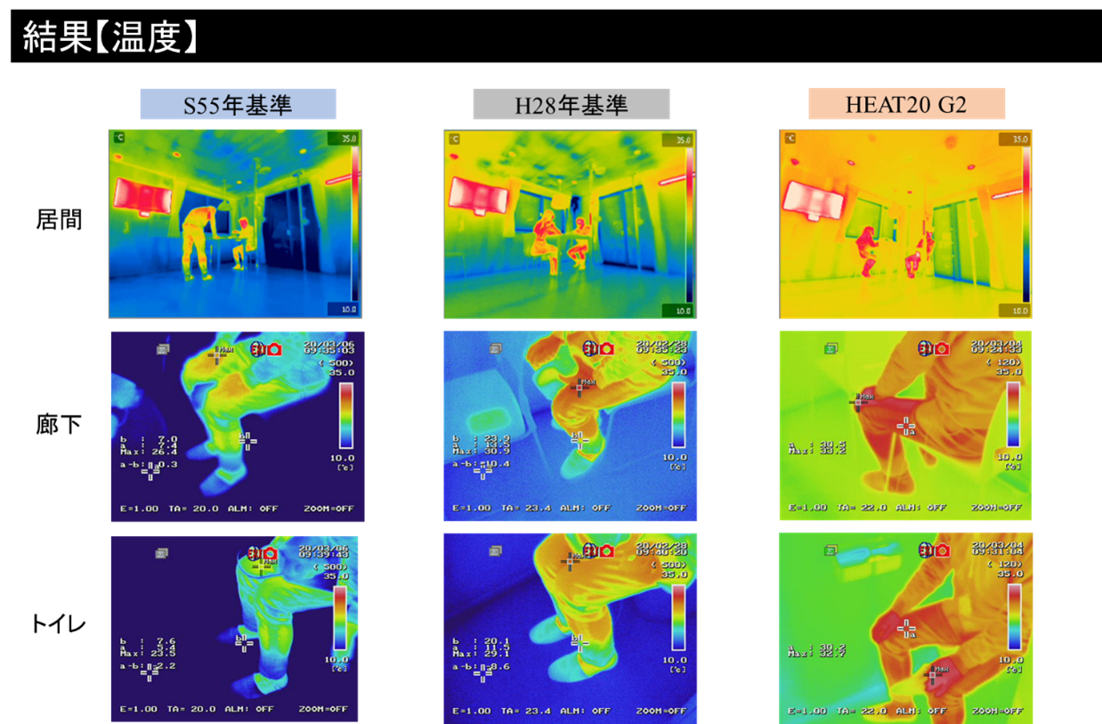 一方で、断熱性能を高めたこれからの家(HEAT20 G2)では、その温度差が5.3℃と2つの基準の家と比較すると半分近くになっていることが分かります。部屋ごとの温度差が少なくなるということは、その分、部屋間を移動する際の身体への負担が小さくなることにも繋がりますので、結果的にヒートショック発症リスク軽減などにも影響をおよぼすことが出来るとされています。