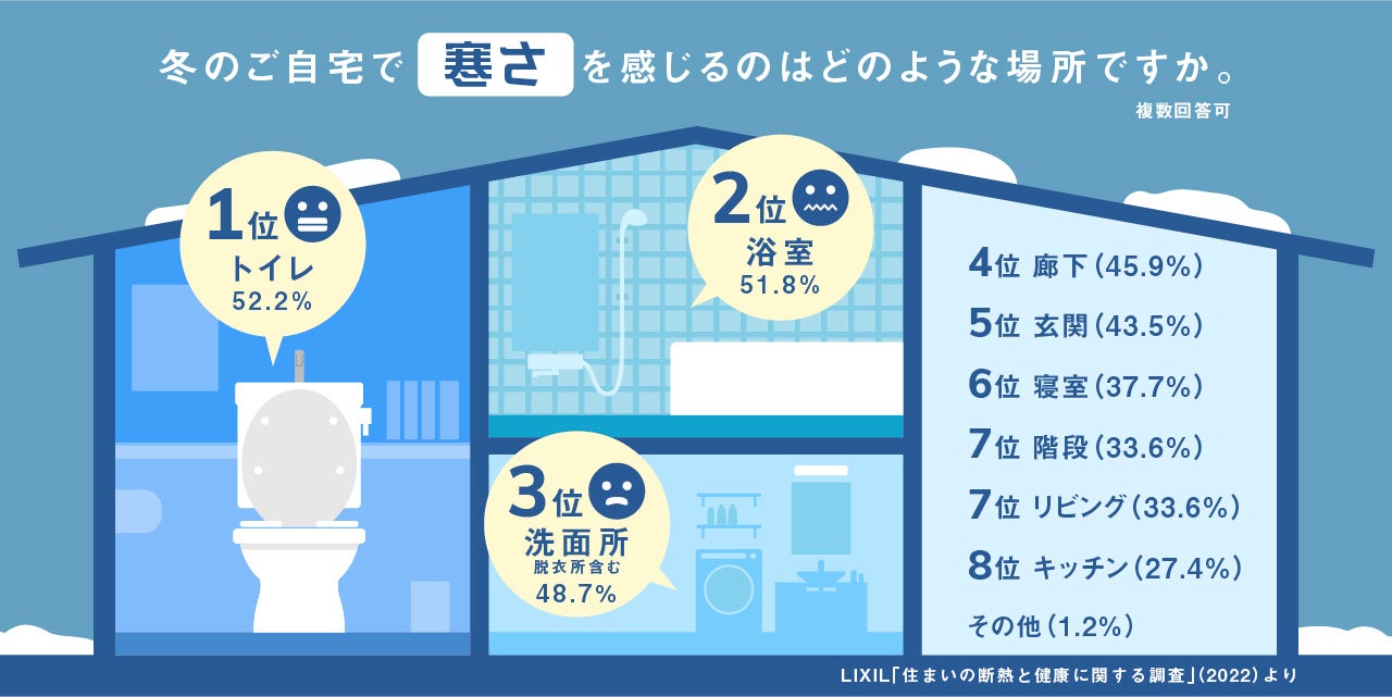 冬(主に11月~2月)の住まいで寒さを感じる場所として最も多く挙がったのが「トイレ(52.2%)」で、次いで「浴室(51.8%)」、「洗面所(脱衣所含む)(48.7%)」でした。一方で、「リビング(33.6%)」や「寝室(37.7%)」と、普段生活をしている場所では、寒さを感じている人が比較的少ない結果になりました。