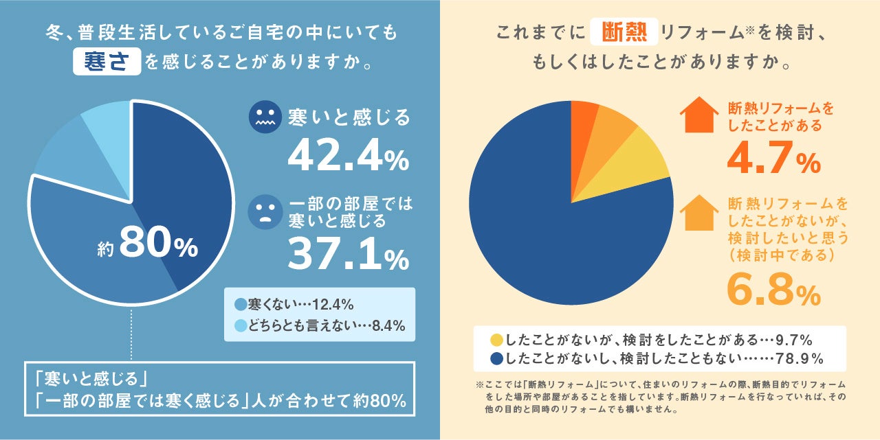 普段生活している住まいで冬(主に11月~2月)に「寒いと感じる」または「一部の部屋では寒く感じる」と現在の住まいで寒さを感じている人が79.4%と高かったのに対し、「検討したことがあるがリフォームはしていない」または「検討したこともない」人が約9割と、自宅での寒さを感じながらも断熱リフォームには至っていないという実態も分かりました。