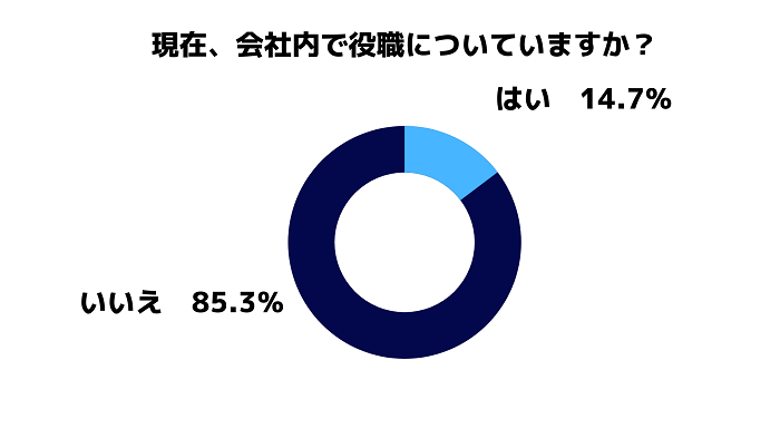 全国の20代に対して現在会社内で役職についているかを調査したところ、現時点で社内で役職をもらっていない人の割合は、85.3%という結果になりました。