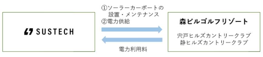本取り組みでは、PPA事業者であり、企業のグリーントランスフォーメーション支援サービスを提供するSustechがソーラーカーポートの設置及び保守を行い、発電した電力を森ビルゴルフリゾートが自社施設で消費する、PPAモデルを活用いたします。(※各施設に約300kWのソーラーカーポートを導入し、各施設が使用する総電力量の約40%を賄う予定です。温室効果ガス(GHG)は年間で約300,000kg-CO2削減できる見込みです。)