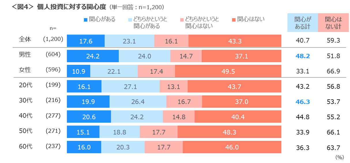 個人投資に対して「関心がある」人は41%であり、男性や30代の関心は高い。<図4>