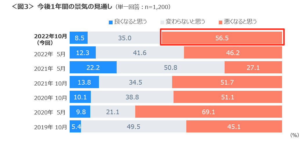 今後1年間の景気の見通しについて「悪くなると思う」と回答した人は、57%と半数を超えた。前年同月から29ptと大きく増加、「変わらないと思う」は35%。度重なる光熱費や食品の値上げと長引く円安、世界情勢への不安も加味し、景気悪化への懸念は強まっている。<図3>