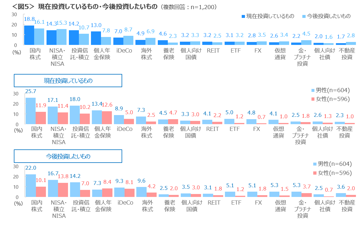 現在、投資している商品は、「国内株式」「NISA・積立NISA」「投資信託・積立」「個人年金保険」「iDeCo」などである。投資している商品と今後投資したい商品の上位の順位は変わらない。性別では、現在投資している人や投資意向が高いのは男性であった。女性において今後投資したい商品は「NISA・積立NISA」がTOPである。<図5>