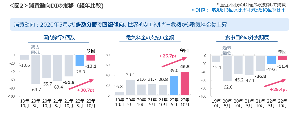 消費動向については、全国旅行支援の開始もあり「国内旅行の回数」は前年同期より39pt、値上げが響き「電気料金の支払金額」は26pt、外出へのハードルが下がり「食事目的の外食頻度」は25ptと大きく上昇した。<図2>