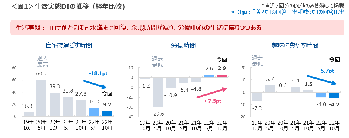 生活実態について、今回調査では「自宅で過ごす時間」が前年同期より18ptの低下、外出自粛でおうち時間が増えた2020年5月からは51ptと大幅に低下、低下傾向は継続。「趣味に費やす時間」は前年同期より6ptの低下。一方、「労働時間」は前年同期より8ptの上昇。自宅や趣味に費やす時間はコロナ前に近づき、労働時間はコロナ前より増えた。<図1>