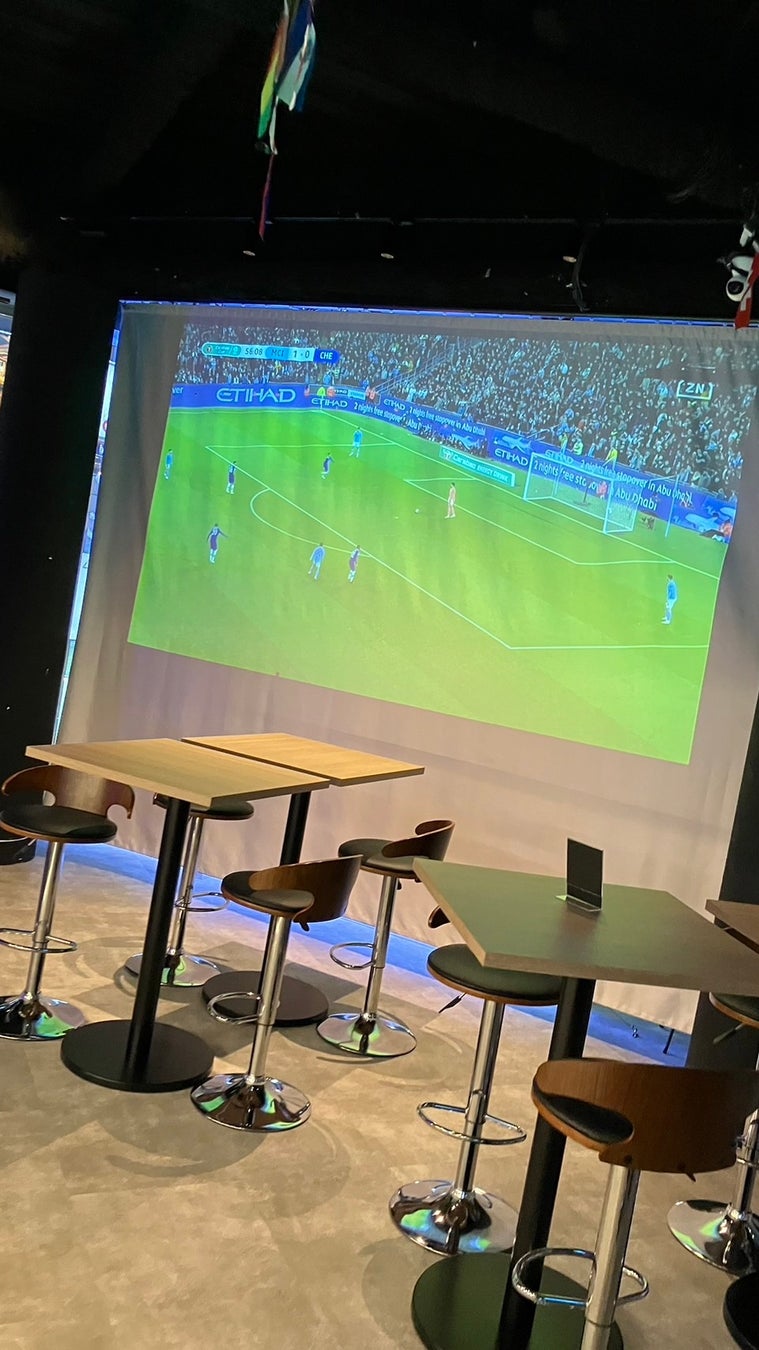 店内には大型スクリーンがあり、臨場感満載!!加えて3台のモニター設置されており、どこからでもスポーツの映像を楽しんでいただける。今注目の最新スポット!!
