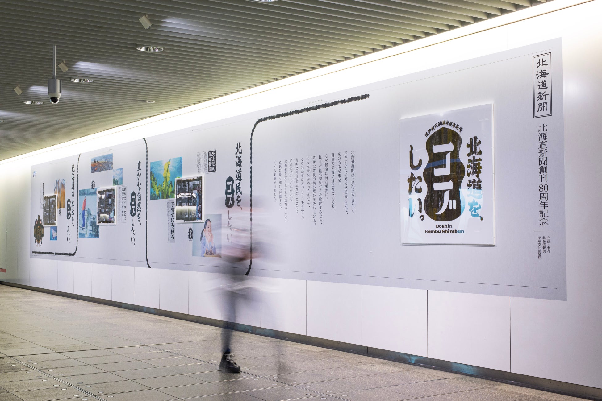 昆布新聞のサンプリング前日の2022年11月14日(月)には、札幌駅前通地下歩行空間「チ・カ・ホ」に昆布交通広告が登場。北海道新聞の 「北海道を、コブしたい。」という想いをダイナミックに表現した昆布交通広告には、多くの方が足を止めていました。