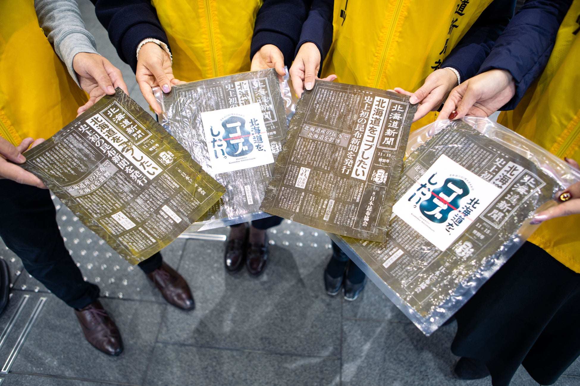 サンプリング当日、北海道産の函館真昆布に食用インクで直接印刷した、『北海道 昆布新聞』を北海道新聞本社ビル正面玄関前にて配布。限定100部が約30分で配布終了するなど、大盛況の中での昆布新聞配布となりました。