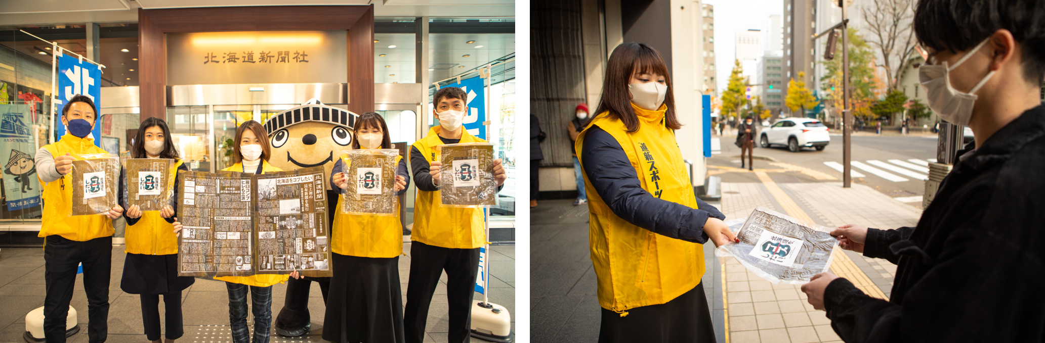 サンプリング当日、北海道産の函館真昆布に食用インクで直接印刷した、『北海道 昆布新聞』を北海道新聞本社ビル正面玄関前にて配布。限定100部が約30分で配布終了するなど、大盛況の中での昆布新聞配布となりました。