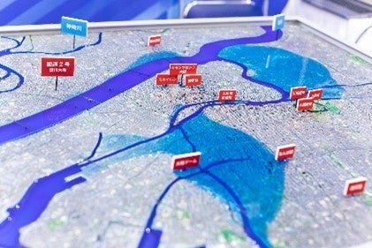 あわせてAIG損保ブースでは、大阪の街の浸水被害を想定したジオラマ展示も行いました。大地震が発生した際に、淀川など大阪の街に流れる大小様々な河川の流域でどのような浸水被害が想定されるかを、大阪の街を模したジオラマに青く着色した液体を流すことで再現しています。先述のVRコンテンツと合わせて体験することで、大阪府民の皆さまの防災意識向上に役立つツールとなっています。