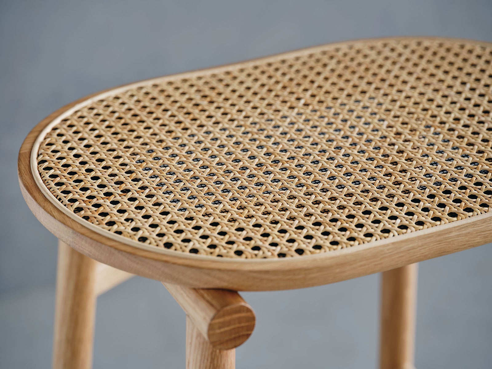 使い続けることで風合いが変わるラタンが張り込んであり、下地にメッシュシートの補強を採用することで座面の耐久性を高めています。