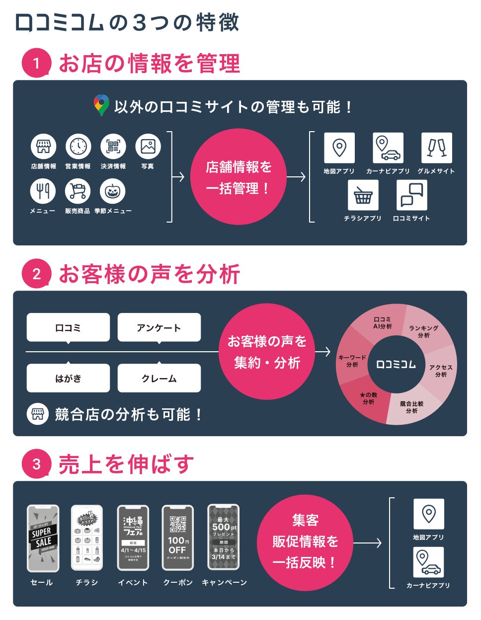 口コミコムは、Googleマップをはじめとした地図アプリや口コミサイトでの店舗情報を整理し一括更新できると同時に、お客様の口コミ分析、クーポンの配信まで行うことで、国内外の口コミサイトを”もっと”売上に変える「口コミサイトの一括管理ツール」です。また、導入頂いた店舗の口コミ数を増やすことにも貢献しておりますので、よりお客様の声を大切にする店舗運営が可能となります。